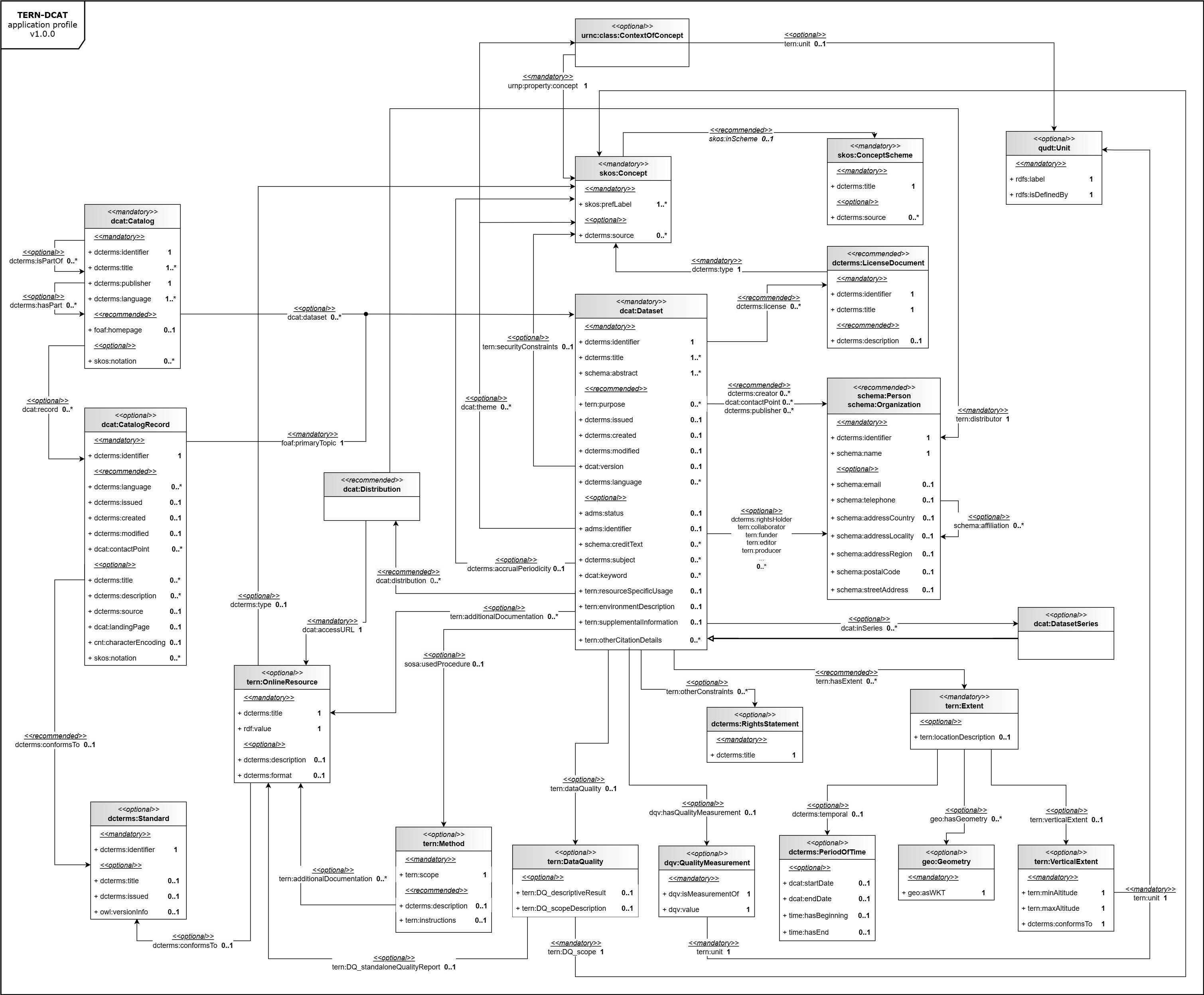 TERN-DCAT uses most of the core properties of the main classes from the DCAT [[vocab-dcat-3]] specification including some additional ones (defined by [[TERN]] or by other specifications as DCAT-AP [[DCAT-AP]]). These additional properties or classes have been added or created in order to best fit the usage of the TERN-DCAT profile, which is the faithful representation of the TERN Metadata Catalogue which follows the ISO 19115 [[ISO-19115-3]] standard profiled as TERN-ISO [[TERN-ISO]].